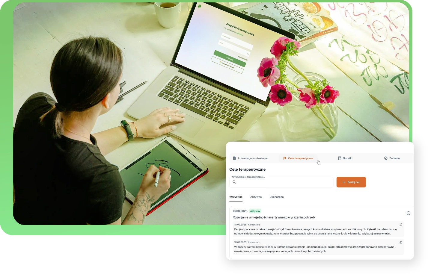 Twórz zadania w dowolnym momencie – w trakcie sesji lub między spotkaniami. Pacjent realizuje je w swoim panelu, a Ty na bieżąco widzisz jego postępy.