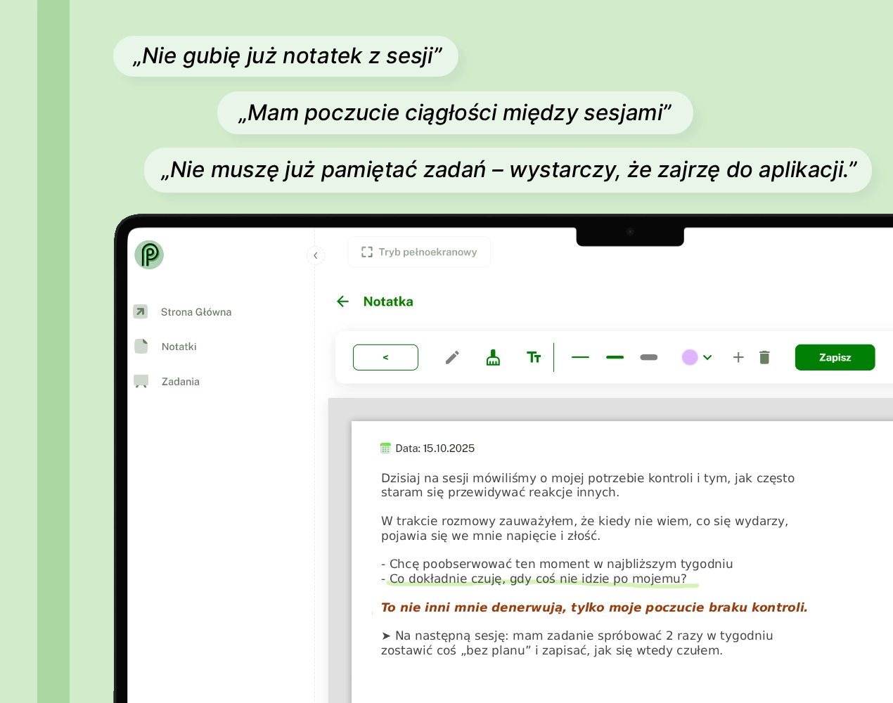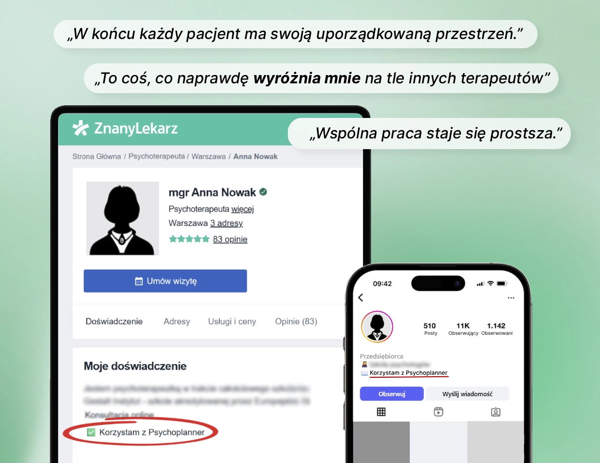 „W PsychoPlannerze wszystko mam w jednym miejscu. Przed spotkaniem szybko przypominam sobie ostatnie wątki, a w trakcie dopisuję kolejne obserwacje.”